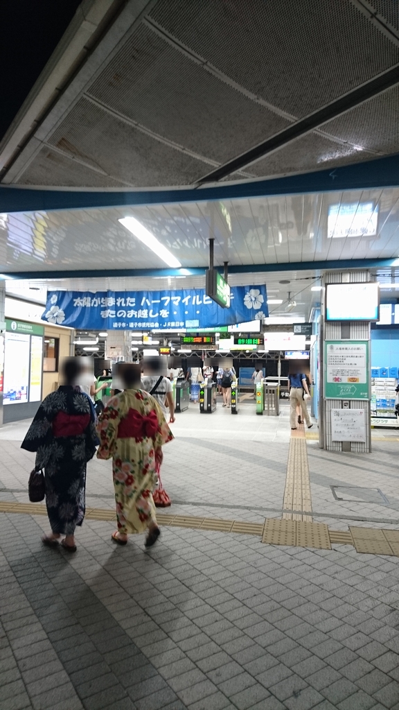 電車は座席が埋まる程度には乗車していましたが、まだ空いていました。ちらほらと花火大会目当ての人も。学生やおばちゃんが主体。定時後ぐらいに爆発的に増えると予想。